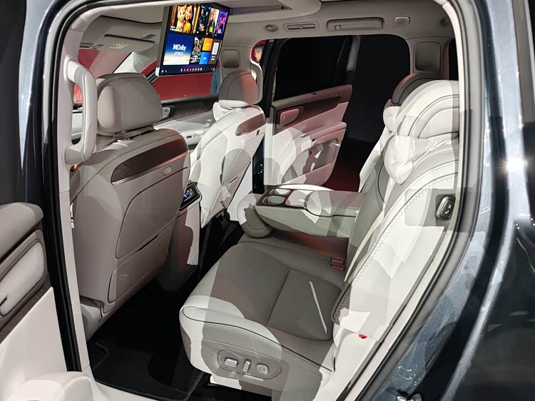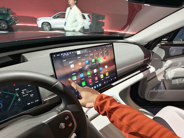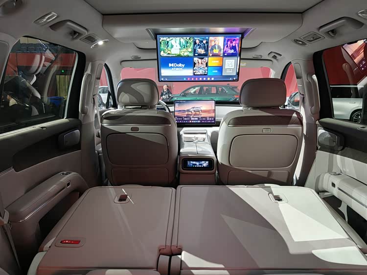 4、 采用两颗高通骁龙8797的舱驾一体方案,支持60英寸AR-HUD、前排17.3英寸中控屏和后排21.4英寸的3K屏幕。而1280TOPS算力直接反映在智舱上有一个功能——新版本的车机系统下拉菜单可以实现类似iOS 26上的透明玻璃效果,虽然没有苹果精致,但效果很考验算力。同时之后也会支持端侧AI大模型、智驾可以支持VLA辅助驾驶。