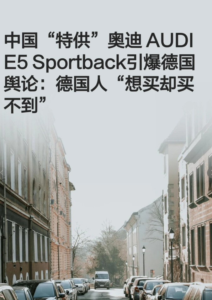 近期,一款只在中国市场销售的纯电车型——奥迪 AUDI E5(参数|询价) Sportback,在德国汽车圈掀起了轩然大波。没有传统四环标识、专为中国市场定制的它,凭借“3万欧元级(约23.59万人民币起)+800V高压架构+773km续航”的硬核组合,让德国网友集体破防,社交平台满是“为什么我们买不到这样的车?”的灵魂拷问,这场跨越国界的“购车焦虑”,背后藏着中国新能源产业的实力逆袭。