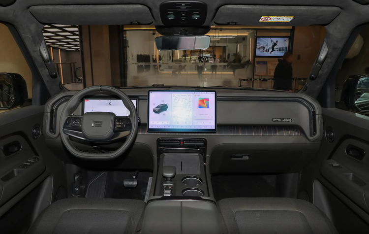 极石ADAMAS内饰提供夜檀黑,星河紫,霞光橙,云絮白等颜色可以选择,方向盘采用两幅式设计,全液晶仪表的尺寸为12.3英寸,中控屏幕的尺寸为15.7英寸,车机芯片为高通骁龙8155,后排屏幕的尺寸为15.7英寸,座椅采用Nappa真皮材质,车载冰箱为标配。