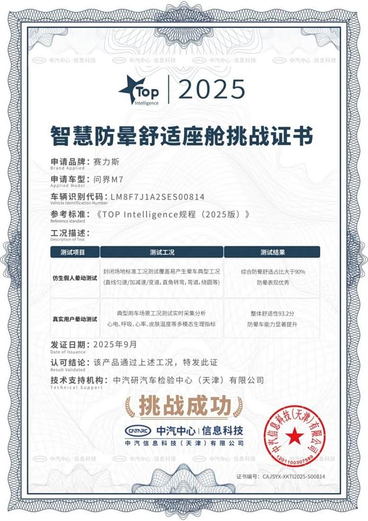 健康是这一切的前提。车辆率先获得权威“零甲醛”认证,从源头材料严格管控,呵护孩子和长辈的每一次呼吸。静谧是品质的底色。其搭载的赛力斯超级增程系统荣获中汽研“静音之星AAA”认证,通过超过150种声学材料的应用和对260余处噪音源的优化,即便以120公里/小时高速行驶,车内噪音也仅60.2分贝,营造出图书馆般的宁静氛围。