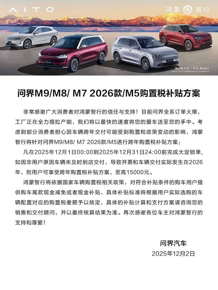 此外,针对2025年12月1日至31日期间完成大定锁单的用户,还特别提供交付保障:若非用户原因导致车辆需延至2026年交付,用户可获得最高15000元的购置税补贴。这一系列切实举措,展现了品牌回馈用户的十足诚意。