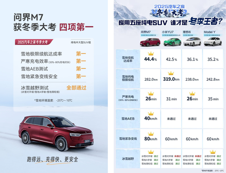 对于家庭用户而言,车辆的安全与可靠从来不是选择题,而是所有幸福的起点。全新问界M7将这份责任,转化为一套贯穿日常与极端环境的缜密防护体系。它的可靠性,在近日汽车之家2025冬季大考中得到了实证。在最低达-25℃的极寒环境中,它在纯电中大型SUV组别中勇夺四项第一:雪地续航达成率44.4%(位列第一)、严寒充电效率(30%-80%充电时长)26分钟(位列第一)、雪地AEB测试通过速度达40km/h(位列第一)、雪地紧急变线安全通过速度达80km/h(位列第一)。这组数据,清晰印证了其高效电驱平台与卓越能耗管理能力。此外,它更是一次性征服了冰雪对开坡、雪地A字坡、雪地滑轮组三项高难度越野科目,展现了全场景的稳定实力。