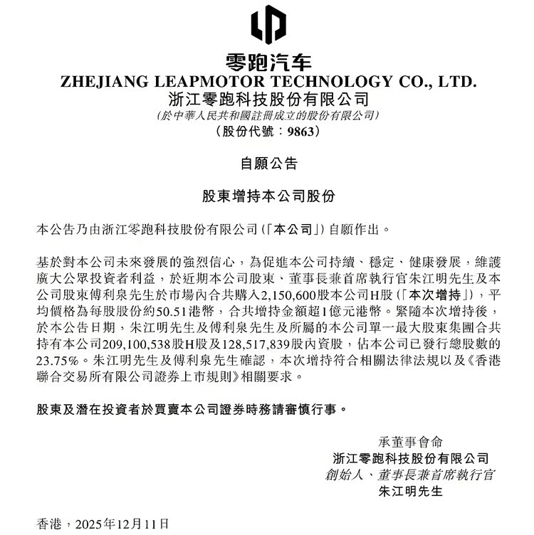 12月28日,零跑汽车在杭州举行了十周年发布会。就在同一日,一纸协议落定:中国一汽旗下公司以约37.44亿元认购零跑汽车增发股份,持股约5%,成为其重要战略股东。每股50.03元人民币的认购价,较当时港股收盘价溢价约11%。