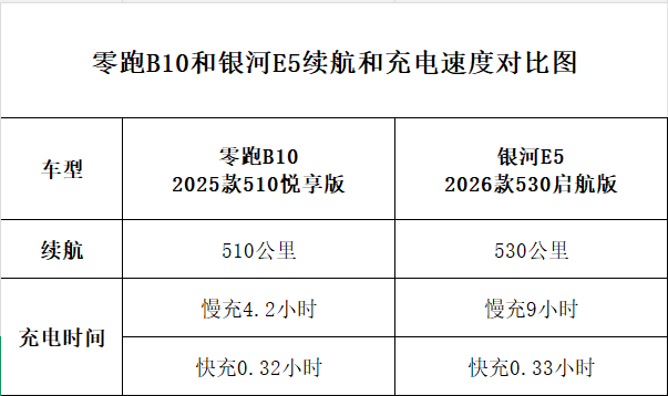 银河E5的续航以530公里对比零跑B10的510公里略胜一筹,而零跑B10的充电速度要快于银河E5,其实最重要的是零跑B10的慢充时间为4.2小时,银河E5的慢充时间为9小时,其实对于家用来说最长使用的是慢充,而快充只有出行可能才会使用,所以说这点我比较看好零跑B10,毕竟银河E5的慢充时间太长了。
