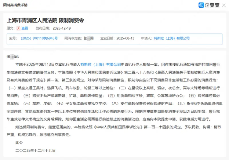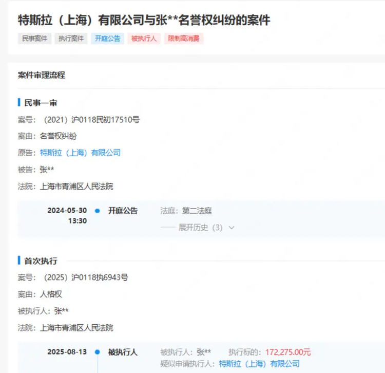 近日,特斯拉(上海)有限公司与张某周之间的名誉权纠纷案件有了新进展。根据企查查平台显示的信息,张某周已被法院采取限制高消费措施,申请方为特斯拉(上海)有限公司。案件相关流程表明,今年8月,张某周已被执行约17.23万元款项。这一系列法律动作,标志着这起持续近三年的纠纷仍在司法程序中推进。