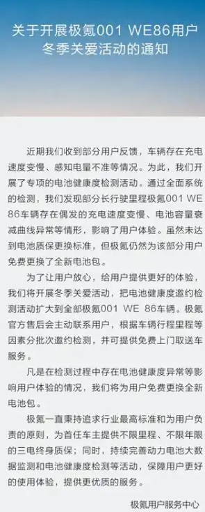 相关数据显示,仅2022年极氪001就售出了超7万辆,其中WE86版占比超60%。而随着极氪001的持续入市,就有部分极氪001 WE86车主反馈,车辆存在充电速度变慢、感知电量不准等问题。最终在2024年12月,极氪汽车发布《关于展开极氪001 WE86用户冬季关爱活动的通知》。