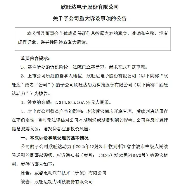 此番股价波动,源自12月26日晚间,欣旺达披露公告称,子公司欣旺达动力科技股份有限公司(下称“欣旺达动力”)于2025年12月25日,收到浙江省宁波市中级人民法院送到的民事起诉状、应诉通知书等诉讼材料。原告为威睿电动汽车技术(宁波)(下称,“威睿电动”)有限公司。