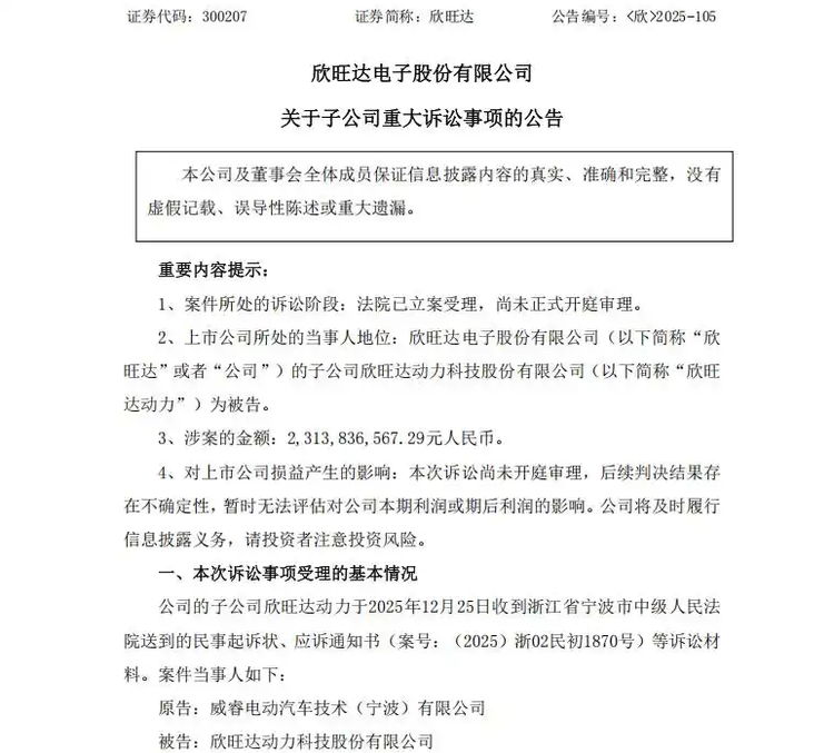 12月26日,欣旺达发布了一则关于子公司重大诉讼的公告,该公告涉及金额高达23.14亿元的买卖合同纠纷。其全资子公司欣旺达动力科技股份有限公司,因买卖合同纠纷被威睿电动汽车技术(宁波)有限公司起诉。原告方称欣旺达动力在2021年6月至2023年12月期间交付的电芯存在严重质量问题,导致其遭受重大经济损失。