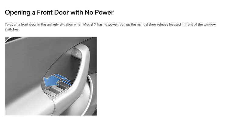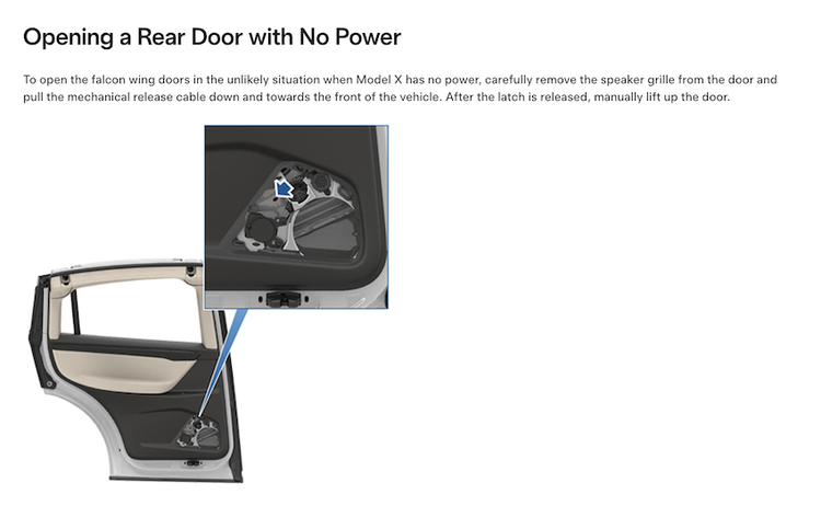 多起致命车祸里,车内人员在特斯拉 Model 3 发生车祸后,难以开启车门逃生,急救人员也无法从外部开启。缺陷调查办公室 指出,请愿书里叙述,机械门释放装置被隐藏起来,没有标签,在紧急情况下很难发现到。