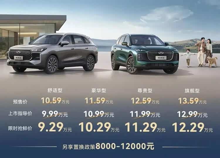 第五代瑞虎 8 分为虎款和豹款,两者在车身尺寸上和外观内饰上略有差异,其中虎款中控屏为 15.6 英寸的横屏,豹款为 13.2 英寸的竖屏,其他配置均相同。四个型号限时起售价为 9.29 万 - 12. 29 万元,虎款豹款在价格方面并无差异。