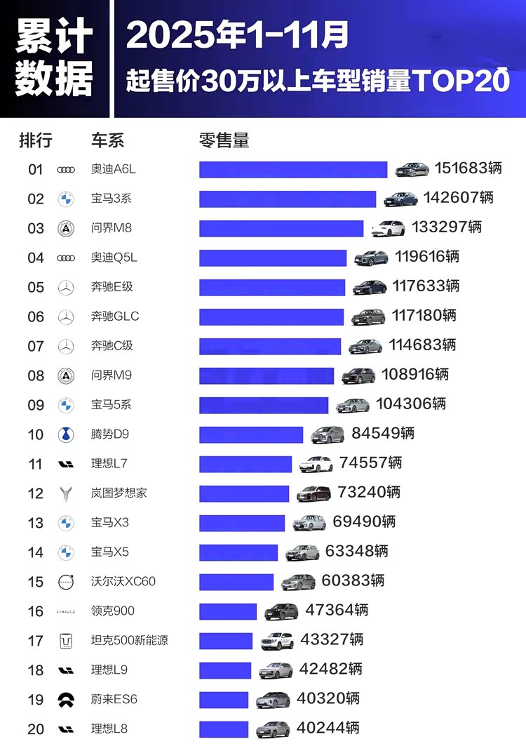这是2025年1-11月起售价超30万的汽车销量TOP20排行榜,真是不看不知道,本以为新能源汽车已经会遥遥领先,没想到bba依旧是最大赢家,20款车上榜了9款,而且这9款车的销量排名还比较靠前,更重要的是有多达7款车销量突破10万台,其中奥迪A6L最猛,突破15.1万台,而奔驰E级突破11.7万台,宝马5系突破10.4万台。