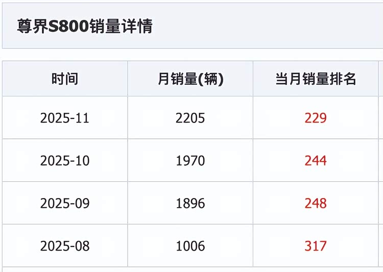 在豪华车市场长期被合资与进口品牌垄断的格局下, 尊界S800(参数|询价)的横空出世打破了固有认知。这款售价覆盖70.80-101.80万元的国产旗舰车型,不仅成功跻身百万豪车阵营,更在2025年11月交出2205辆的销量成绩单,稳居大型车零售榜首,甚至超过保时捷Panamera与宝马7系同区间销量之和。百万级国产车为何能获得市场青睐?其销量背后的核心支撑是什么?而作为上市不久的新车型,其保值率争议又该如何看待?这些问题的答案,不仅关乎一款车型的市场命运,更折射出中国汽车高端化进程的深层变革。
