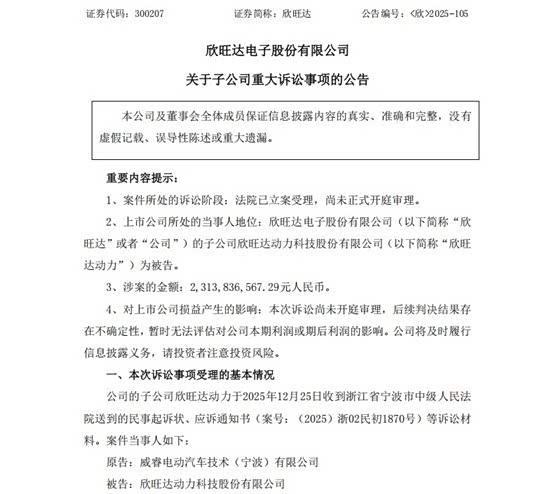 近日,欣旺达公告引爆新能源圈:全资子公司欣旺达动力被威睿电动起诉,涉案金额达23.14亿元!这几乎相当于欣旺达2023-2024年两年净利润总和,败诉即“白干两年”。更关键的是,这并非突发矛盾,而是“你追货款、我告质量”的连环商战,还牵扯到大量理想车主的切身利益。