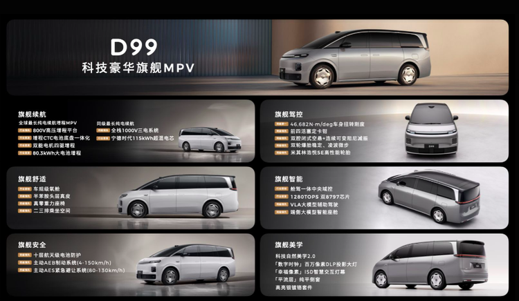 定位科技豪华旗舰MPV的 零跑D99(参数|询价),车长超5米2,车宽近2米,轴距超3米1,推出光电白、液态银等5款自然灵感色。