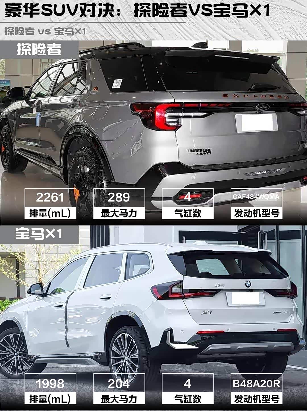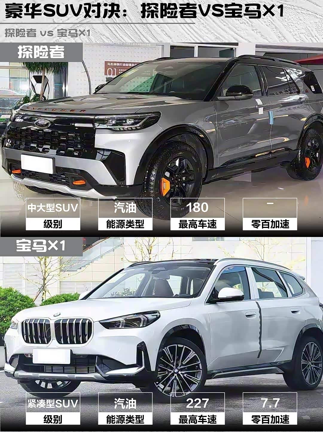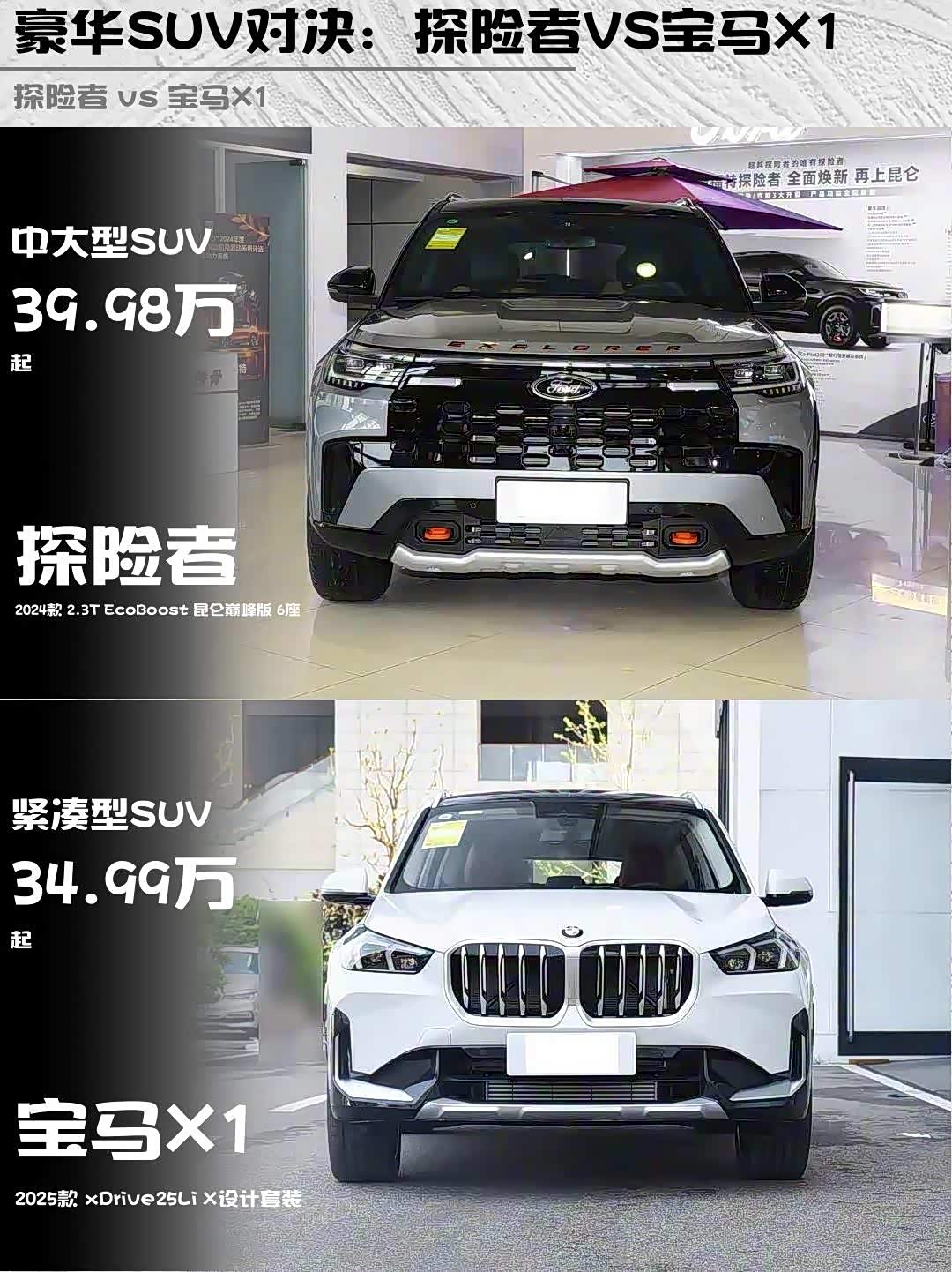 先看硬核数据:探险者2024款 2.3T昆仑巅峰版 vs 宝马X1 2025款 xDrive25Li X设计套装。前者39.98万配2.3T+10AT,后者34.99万用2.0T+7DCT。价格差5万到底差在哪?往下看👇