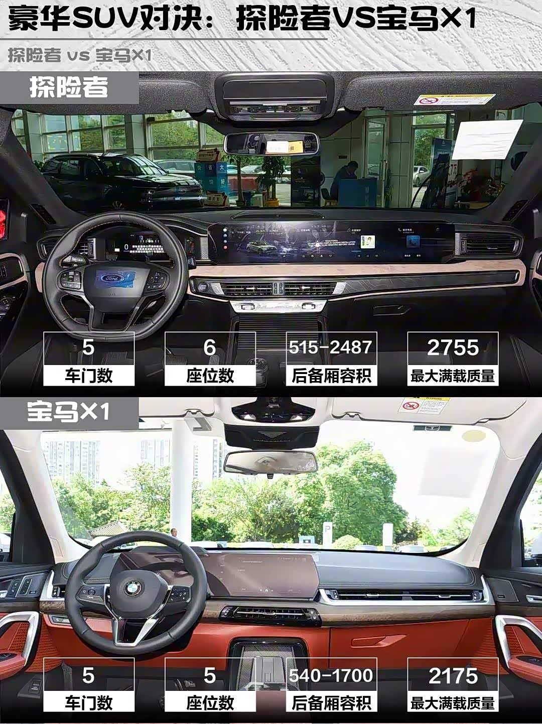 🎮科技配置:探险者27英寸IMAX巨屏+整车OTA,副驾追剧爽过iPad。宝马X1的10.7英寸曲面联屏走精致路线,iDrive旋钮盲操更顺手。但探险者标配360全景+全速ACC,宝马X1得加钱选装,这点不太厚道。