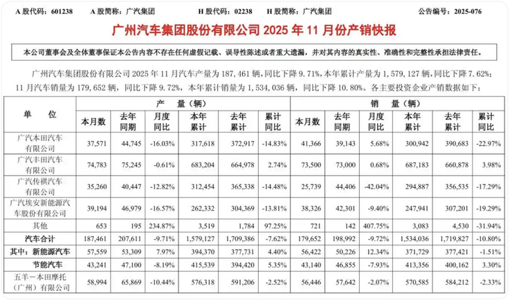高管层的震荡,恰与广汽集团近期披露的销量数据形成了值得深思的呼应。12月初,广汽集团发布2025年11月产销快报,数据显示其当月销量为179652辆,同比下滑9.72%;1-11月累计销量1534036辆,同比下滑10.80%,整体业绩面临不小压力。拆分品牌表现来看,集团旗下合资品牌广汽本田、广汽丰田11月分别实现5.68%、0.71%的同比增长,其中广汽丰田1-11月累计销量更是同比增长3.98%,展现出稳健的市场韧性,但广汽本田虽然11月销量是同比增长的,1-11月份的累计销量却是同比下滑22.97%;与此同时,自主品牌的表现也是堪忧,广汽传祺11月销量同比下滑42.04%,1-11月累计下滑17.29%,广汽埃安当月销量同比下滑9.40%,累计下滑幅度达19.29%。更关键的是,作为集团新能源转型的核心力量,11月广汽集团新能源汽车销量虽同比增长12.34%,但占整体销量比重仅为31.4%,显著低于全市场新能源汽车渗透率,成为制约整体销量回升的关键因素。