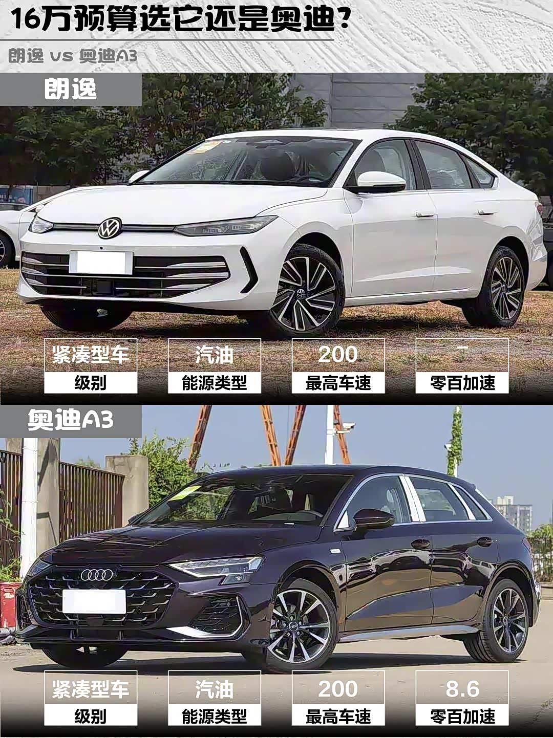 朗逸指导价14.59万,终端优惠后12万出头能落地;A3指导价16.59万,现在优惠完大概15万左右。别看差价3万,A3后期保养(小保养1200+)和95#油都是隐形成本💸