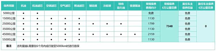 根据吉利官网信息,星越L保养周期为:首保5000公里或3个月内,后续每1万公里或12个月进行一次常规保养。首任非营运车主可享受4.5年或12万公里免费基础保养(含工时及配件)。