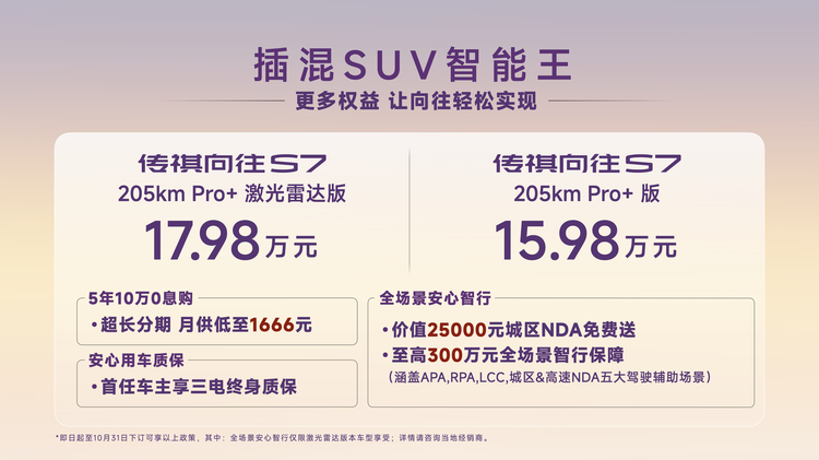 传祺向往S7Pro+激光雷达版17.98万元就能拥有搭载真激光雷达的智能驾驶辅助系统,传祺向往S7的,性价比优势明显。更有5年10万0息的超低门槛金融方案,让智能出行触手可及。在同级别车型中,既有顶尖的MomentaR6大模型技术,又有行业首创的“三担责“售后保障,还配备如此亲民的购车政策,传祺向往S7的综合竞争力不言而喻。选车不仅要看配置参数,更要看品牌是否敢为技术担责,传祺用实际行动证明:真正的智能化,是技术与责任的完美结合。