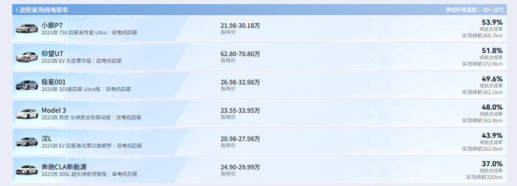 并且我们需要注意的一点是,该媒体的测试条件相当极端,采用“冷车冷充+全程制热+雪地高环”的极限工况,与我们日常通勤场景有显著差异,这也是为什么参选的所有纯电车型中,只有小鹏P7和仰望U7两款车的续航达成率在50%以上的缘故。
