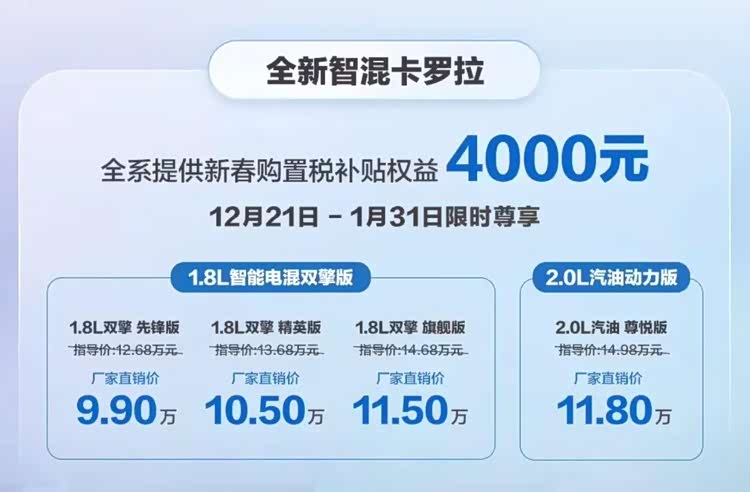 目前来看,一丰卡罗拉给出的诚意更加足够,双擎版直接来个厂家直销价9.9万元,而广丰雷凌L却显得还没有一步到位,价格甚至敢跟天籁鸿蒙座舱卖得差不多,这是真自信!