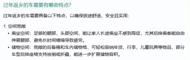 十万块出头的预算,市场普遍的紧凑型SUV选项尺寸约在车长4.5米、轴距2.7米左右。这样的尺寸往往需要在乘坐空间和载物能力之间做取舍,牺牲后排体验,只为多装点是常态。可见,AI将空间列为选返乡“搭子”的第一要素并非空穴来风。