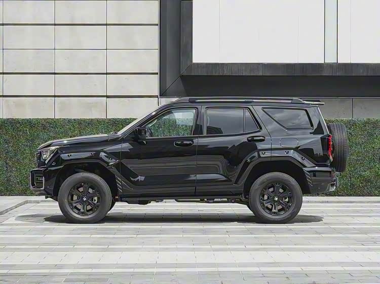 侧面是它最出彩的地方。轮拱外凸且装了裸露铆钉,这种传统越野车的经典元素被玩得更彻底——轮拱直接延伸到车门下方,和车身融为一体,再加上高腰线设计,整个侧面层次感极强。车顶行李架、侧开尾门、中置备胎盖板这些硬派配置一个不少,但设计师又加了点小心思:备胎盖板做成方形,多了几分机甲风味;电吸尾门带固定锁止功能,越野时不用担心尾门自己弹开。尾部能量翼机械尾灯搭配大尺寸半露式备胎,辨识度极高,晚上开出去绝对能成为车流中的焦点。