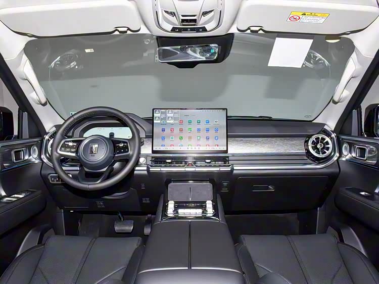 坐进车里,你会发现这车的内饰和外观反差挺大。外观是硬核机甲风,内饰却走的是“硬朗中带点温柔”的路线。中控台用了对称布局,大量软性材质包裹,小腿以上能接触到的地方基本都是软的,触感细腻,甚至比很多城市SUV还讲究。金属质感的装饰条和外露铆钉又提醒你:这车骨子里还是硬派越野。