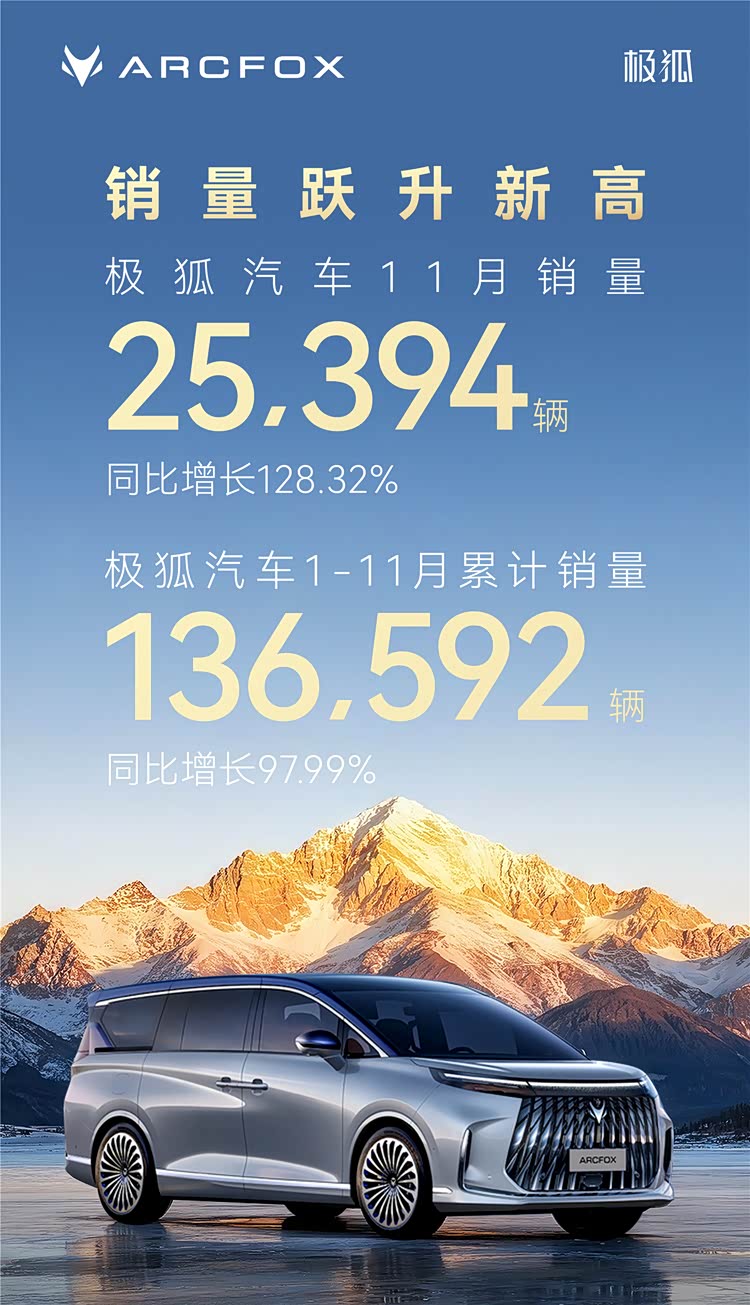 年末的汽车市场,各大车企正全力为销量冲刺,以期在年度销量榜上占据一个更耀眼的位置。在这股浪潮中,极狐汽车的表现不可谓不亮眼。今年11月,其销量达到25394辆,同比大幅增长128.32%,今年1-11月累计销量已突破13万辆大关,达到136592辆,同比增长率高达97.99%。