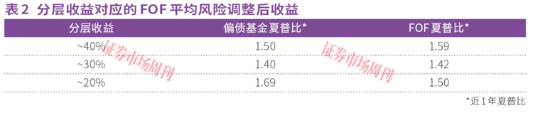 更为关键的是,和“固收+”类似,FOF攻守兼备的优势非常明显。今年以来“固收+”里风险最高的偏债混合基金平均收益5.83%,要显著低于权益FOF平均的11.99%。但在“固收+”投资者更为关注的风险调整后收益这一项中,FOF却并未显现明显劣势。表2是分层收益对应的FOF基金平均风险调整后收益,和偏债混合基金相当。