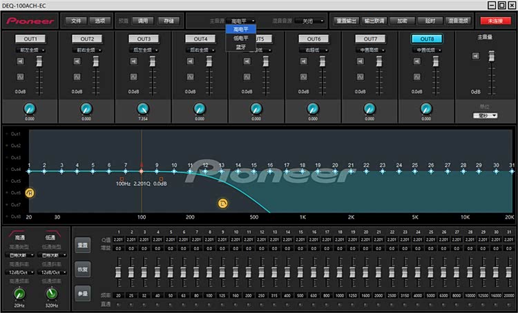 DEQ-100ACH-EC的核心优势在于其强大的调音能力,融合了先进的数字信号处理技术与灵活的调音功能。设备内置8通道DSP,每一声道均可独立进行31段EQ均衡调节,频率范围覆盖20Hz-20kHz。支持三种专业滤波模式,斜率从6dB/Oct至48dB/Oct灵活可调,相位0-180°可选,延时精度高达0.000ms-20.000ms。用户不仅可通过电脑软件进行精细调节,还可借助手机应用程序随时调整音效,操作便捷且功能全面。