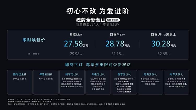 辅助驾驶早已不是“锦上添花”,而是家庭出行的“安全刚需”。全新蓝山智能进阶版作为行业首款搭载长城VLA大模型的量产车,直接将辅助驾驶拉到“入门即满配”的新高度——全系标配激光雷达、27颗智慧传感器和算力达700TOPS的Thor-U芯片,高速NOA、城市NOA功能终身免费,无需额外付费升级。