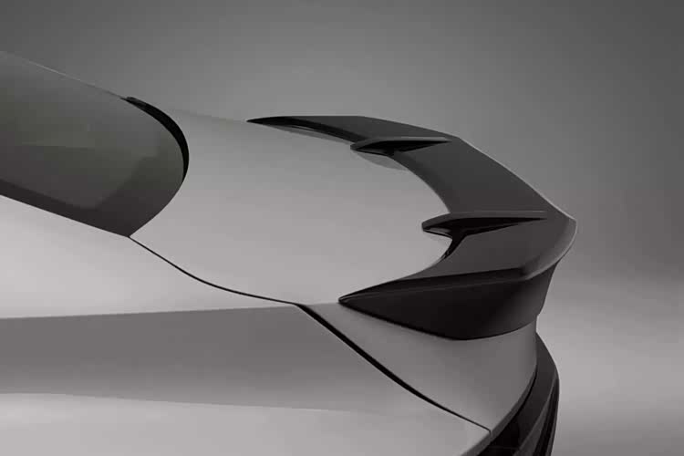 侧面采用了溜背造型设计,营造出了轿跑车型的姿态。腰线从前翼子板处贯穿至后翼子板,整体感觉并不锋利,但后门轮拱处采用了折线设计,营造出了不错的光影效果。后视镜、车窗周边以及车顶的鲨鱼鳍采用了黑化处理,在细节上提升了质感。门把手依旧是传统样式,所有车型均配备全新设计的19英寸轻量化铝合金轮毂,另外可选装红色刹车卡钳,进一步提升运动感。