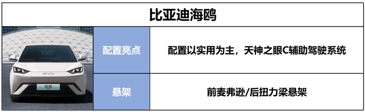 比亚迪海鸥的配置就是以实用为主,配有智配有天神之眼C辅助驾驶系统,全场景智能泊车功能,智能体验确实不错。不过它采用的是前麦弗逊后扭力梁悬架,过一些颠簸路段的时候你就会感觉减震效果没那么好,驾驶体验和乘坐舒适性就一般般了。
