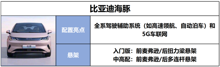 比亚迪海豚的配置相对均衡,做工质感也不错的,辅助驾驶系统可以说是它的亮点,可以实现高快领航以及智能泊车功能。但是指导价10万以下的车型,采用的后扭力梁的悬架,指导价超过10万的车型才配有前麦弗逊后多连杆悬架,所以预算10万以下买海豚,驾驶体验和乘坐乘坐舒适性就没那么好了。