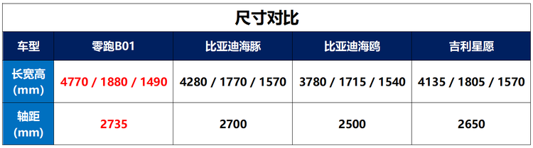 作为家用纯电小车,空间的大小也很重要,空间越大表明更能装乘坐也更舒适。零跑B01、海豚、海鸥以及星愿这四台车的身材差别很大,零跑B01车长4.77米,轴距2.735米,是标准的紧凑型轿车,相比其他三款车,可以说大了一圈,坐在二排翘个二郎腿都很轻松,后备箱还能放下几个行李箱,用起来感觉都不一样。海豚的身型看起来就比零跑B01小一圈,它的轴距2.7米,二排的腿部空间也还不错。海鸥车长只有3.78米,轴距2.5米,空间确实相对比较小,但平时停车、钻小巷子就很灵活很方便。吉利星愿在储物格设计上花了更多心思,比如中控台下超大的贯通空间,很适合放包,但车身尺寸以及轴距都比零跑B01小很多,空间自然就没零跑B01那么宽裕,这四台车对比,零跑B01的空间表现确实是越级的存在,乘坐舒适度自然也高一个级别。
