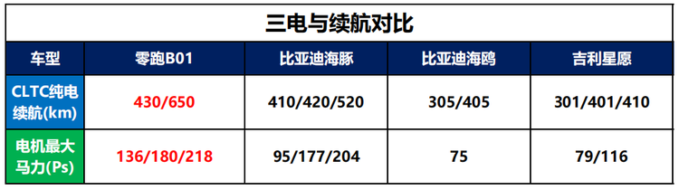 买纯电车需要看两个关键数据,续航和电机的动力表现,续航越长平时用车的便利性更好,因为不用频繁充电,动力更强自然驾驶体验感更好,开得更爽。看四台车的续航对比图就很清晰,5-10万的预算,零跑B01可以买到430km和530km续航的车型,而海豚可以买到410km和420km续航的车型,海鸥能买到305km和405km续航的车型,吉利星愿只能买续航301km,401km以及410km的车型。很显然,零跑的续航更长,使用便利性就更好了,都是5-10万预算买车,当然选续航更长的车更好,如果预算充裕,还可以考虑续航650km的零跑B01高配版,这意味着周末跨城出游都可以很从容,不用担心续航的问题。