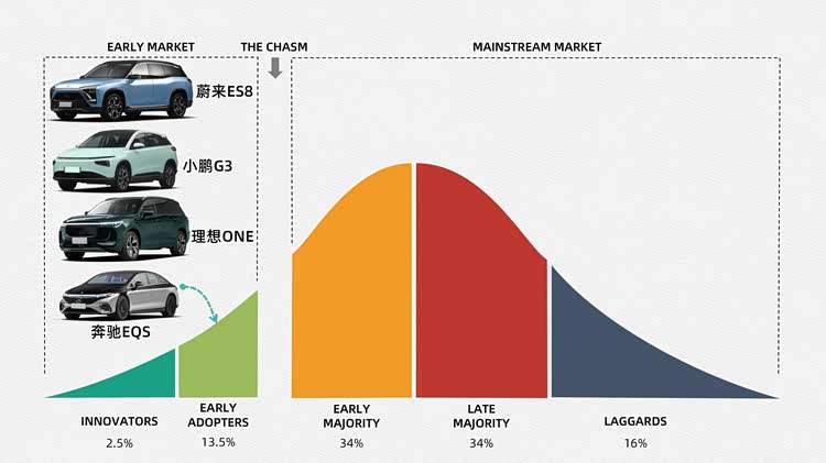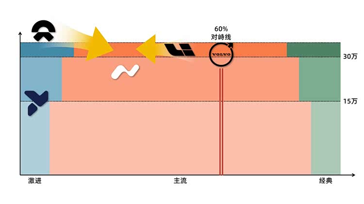 2025年,新能源渗透率最终达到了60%。我们发现这个市场可能存在35%-40%的用户永远不会选择新能源。于是在60%渗透率处产生了对峙线。对峙线附近的用户需要产品兼具燃油与新能源的好处,审美最好也是两者均衡。