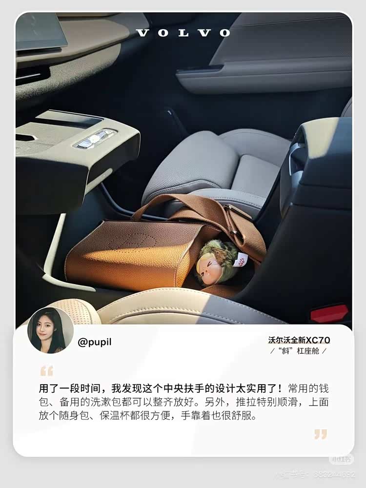 男性与女性需求的平衡:沃尔沃的问界M9智电产品相比传统燃油产品,一个巨大的差别是女性有了更多驾驶的意愿和可能。谁说女性只能开EX30,XC70 长度4米8,但配上自动泊车、辅助驾驶,女性也可以轻松应对。24-25年的爆品问界M9是国内最早强调尊重女性购买决策的产品。大哥座驾,也要大嫂满意。我们从女性的视角来看下XC70的企划思考。有冷气,无冷风:传统汽车空调出风口是设计师炫技的地方,XC70把空调出风口全部隐藏起来。可以感受到温度快速下降,但不是冷风直吹。
