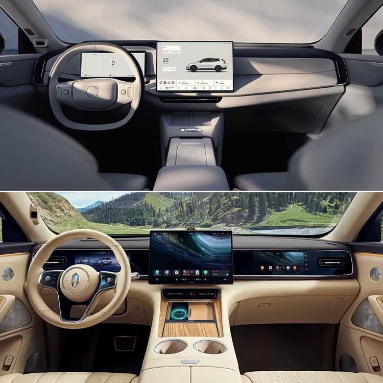 沃尔沃的座舱过去基本策略是以驾驶者为中心。XC70相比其他产品,屏幕和中岛倾向于驾驶席的角度稍微减少了一些。屏幕采取横向布局,它更加兼顾主副驾对屏幕信息的要求。如果选择双色车身(目前四驱款型上才有),车内有超强的起居室感。XC70的方向盘也不像XC60那么圆,这是考虑避免对屏幕信息都遮挡。在色彩上的考虑则是减少方向盘的沉重感。对于女性用户,会感觉方向盘没有那么沉,这台车应该轻巧敏捷好开吧。对比而言,XC60更加大哥感,XC70更加中性。SHOW TECH VS SHY TECH:问界新的M7与M9一样,大幅度增加了女性的好感度,但内饰的设计逻辑追求大哥好理解的豪华——显性豪华。M7是不需要感知,第一眼就能看懂的豪华。XC70是典型的Shy Tech,U型的内饰结构(M7 T型结构)层叠设计产生出层次感,也给非直射氛围灯布置留出空间。木材的色彩纹理选择,皮革的选择贴近于自然温馨。看起来不如问界贵,但五感体验上来之后,也有自己贵的理由。