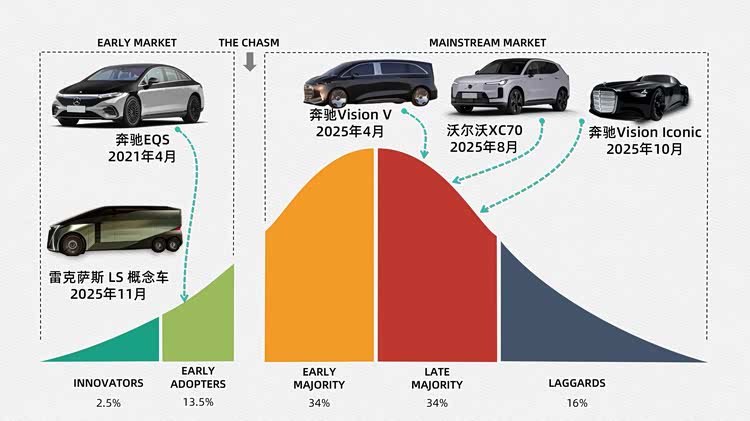 2021年,“蔚小理”这个概念出现。2021年,电动车渗透率跨过15%。新旧势力对抗正式开始。新势力品牌向右推进,BBA向左反击。奔驰EQ作为先锋代表,向左翼狂攻,但事实上效果并不好。2025年奔驰发布了Vision V与Vision Iconic两台有巨大格栅的概念车。这代表着奔驰设计从激进创新迅速回调为永恒经典(Timeless Design)。现在传统豪华中只剩下两个先锋派雷克萨斯和宝马新世代。奔驰两台概念车指向的审美与用户价值点,正是2025年沃尔沃发布的XC70。