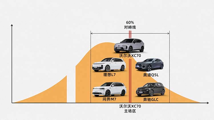 这并不是一个玩笑话,60%对峙线左右加减20%就是沃尔沃的主场区。新旧势力开撕:沃尔沃成为隔离带对峙线左右的用户,除了牌照所限的情况,并不是一定要买哪种动力形态的产品。他们需要的是体验与审美。踩到对峙线上的产品,天然吸引到的用户规模就大。沃尔沃XC70,极氪9X成功就是这种针对靶心的产品。对于沃尔沃而言,这条线两侧是过去的基本盘,三高(高学历、高收入、高职位)和三师( 教师、医师、律师 )人群。沃尔沃成为新旧势力隔离带时。我们会发现“蔚小理”+华为系产品在争取的传统高净值用户、BBA在争取的智电用户所宣传的产品卖点,刚好都是沃尔沃的XC70产品特征。踩在对峙线左右通吃的沃尔沃XC70像是游戏里发育最快的打野位,自己野区吃完后还能到中路和边路蹭线。金牌打野沃尔沃XC70 11月销量5354台,上市仅70天便销量破万。XC70在吸引谁:传统豪华的守门员沃尔沃的竞对产品从未如XC70这么杂。问界M7、理想L7,奥迪Q5L、奔驰GLC。M7、L7的存在会把BBA的用户吸引到XC70的主场区。BBA没有特别合适的产品来承接,于是XC70成为传统豪华的典型代表与M7、L7对线……XC70的产品特征是什么?审美:有情绪的科技感——60%对峙线上的审美风燃油审美与数字化审美如果找到最大公约数,需要解决两个问题——让数字科技感的车有更多情绪,让传统追求马力感的车有更电子产品的精致感受。