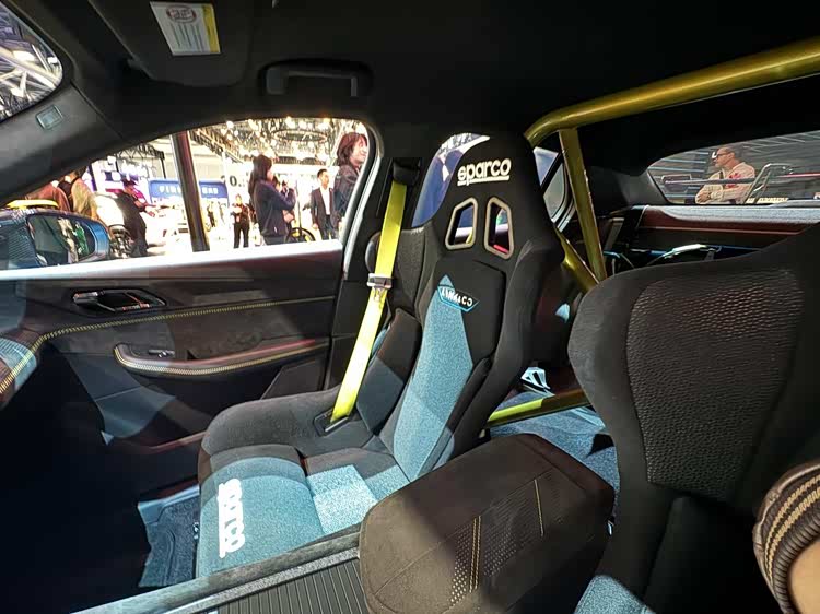 进到车内,首先映入眼帘的是特别粗壮的防滚架,若是专业赛车,防滚架会延伸到驾驶席前方,对于这辆车来说,防滚架更大的作用是装饰,所以,它只安装在后排。这样一来,后排就失去的乘坐的功能。跟拉力赛车一样,这辆车只有主驾驶和副驾驶可以坐人。