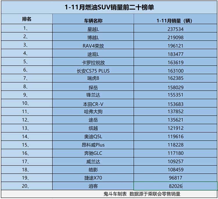 这一点,在销量上体现得更明显。日前,小编根据乘联会零售销量数据,整理出1-11月份燃油SUV销量排名前二十榜单,结果,鬼哥发现,榜单上共有18款车型累计零售销量超过十万辆,接下来,看看具体车型的排名和销量表现。