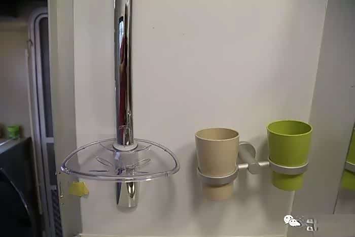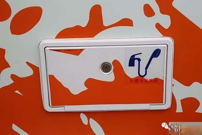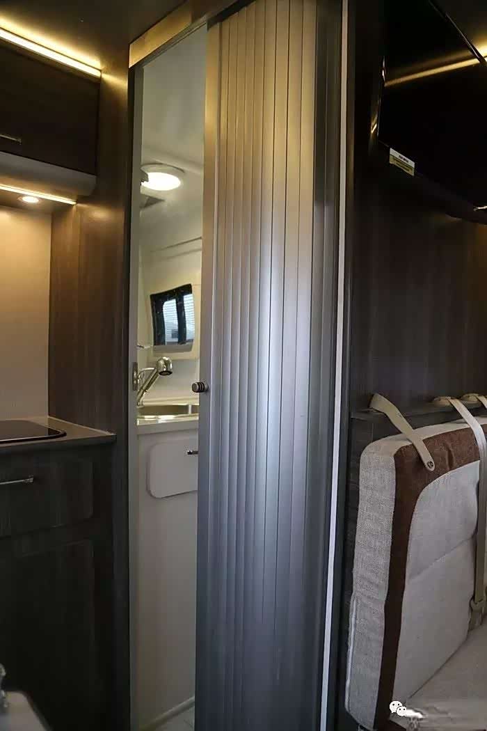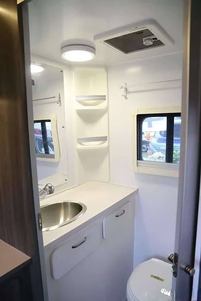 车内尾部的卫生间配备了电动马桶、洗脸盆、抽拉式花洒以及置物架和卫浴镜等便利设施。此外,卫生间顶部还安装了照明灯和双向通风换气扇,既确保了良好的照明,又保持了卫生间内部的空气干燥。
