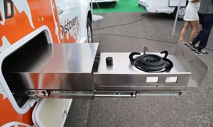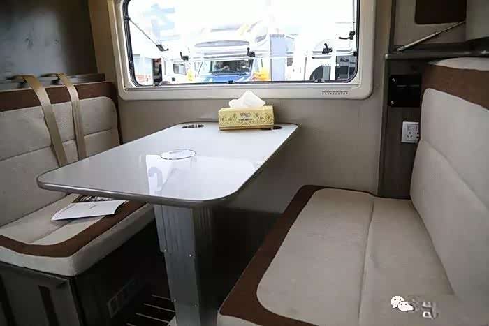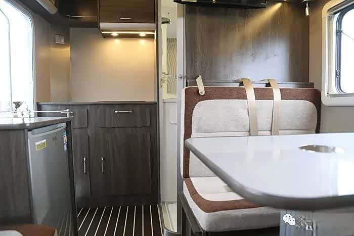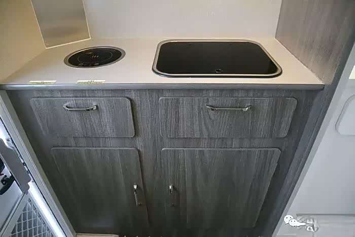 厨房后方是冰箱所在,设计十分便利,便于在烹饪时轻松取得食材。冰箱上方设有一张方形桌子,可额外放置预备食材,从而巧妙地增加了烹饪空间。然而,若您喜欢煎炒烹炸等烹饪方式,建议使用外置燃气灶。这样不仅能更好地施展您的厨艺,还能避免油烟污染车内空气。