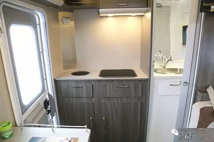 单排皮卡房车的内部布局与常见的C型房车存在差异。其车身侧面尾部设有车门,进入车内左侧是厨房区域。厨房台面上配备了电磁炉和可开启式的洗菜池,十分方便。此外,台面的上方和下方均设有储物柜,可以整齐地存放食材和厨房用具,空间利用非常合理。