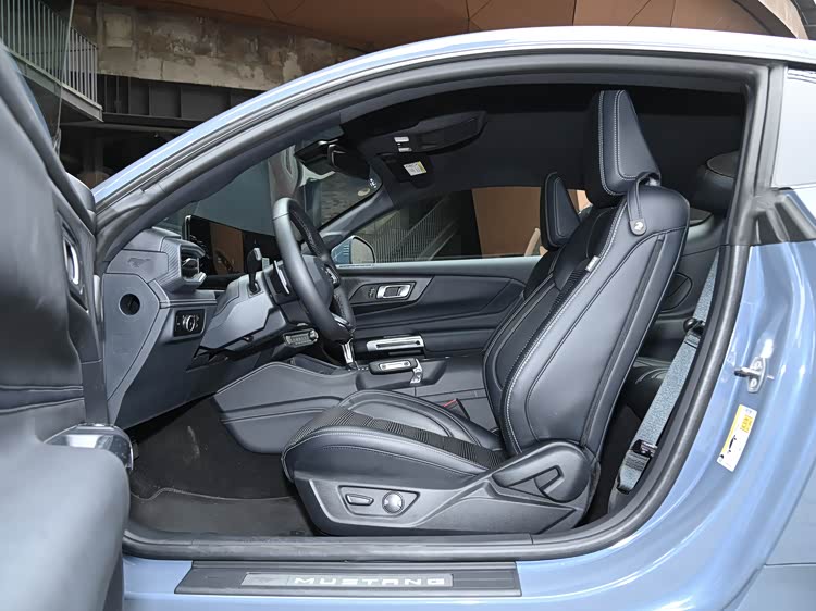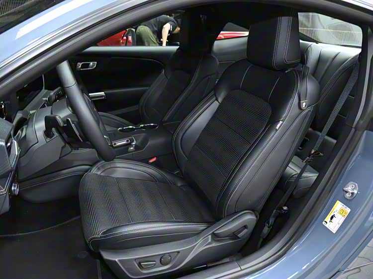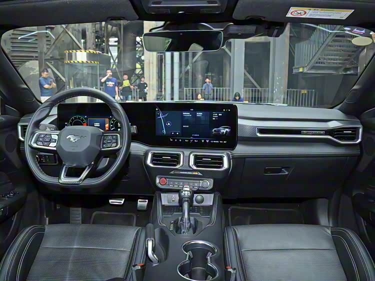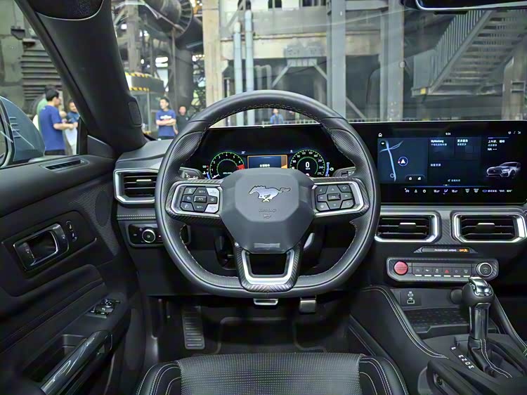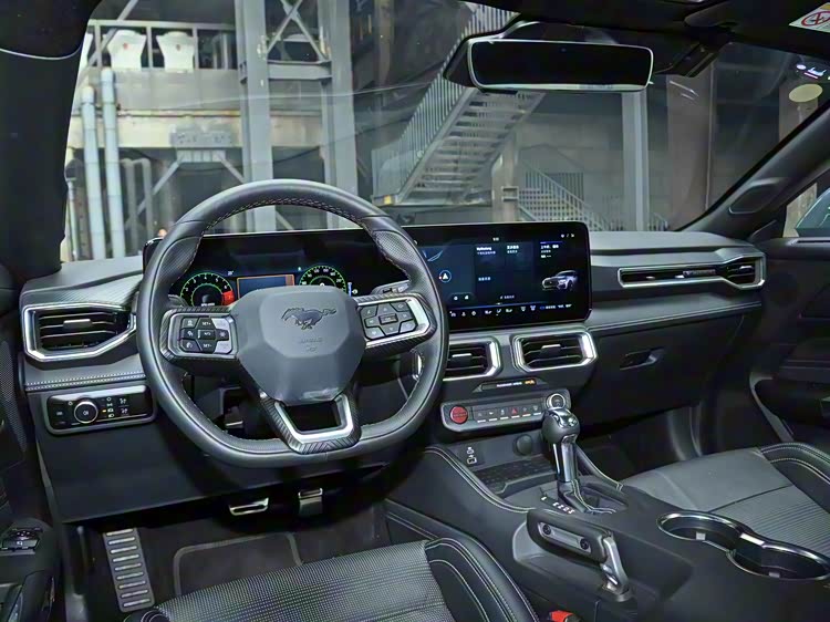 配置也跟上了时代。12.4英寸仪表加13.2英寸中控屏组成双联屏,SYNC4系统操作逻辑挺顺手,支持3D导航和语音控制。切换驾驶模式时仪表盘会有动态转场动画,挺有仪式感。中控台用了碳纤维饰板配红色缝线,运动氛围到位。平底方向盘握感扎实,配了换挡拨片和加热功能,冬天开车手不会冻。保留了传统机械换挡杆,虽然没有手动挡那么纯粹,但比那些电子旋钮有驾驶感多了。