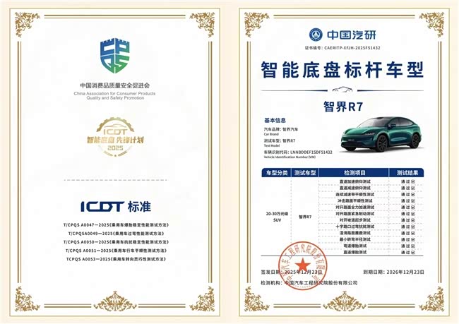 在冬季冰雪路面上行驶,安全是驾乘者的首要关切。值得关注的是,智界R7是目前20-30万级纯电SUV中唯一通过“2025智能底盘先锋计划”标杆车型认证的车型。该认证由中国汽研权威机构主导,基于行业首创的ICDT智能底盘综合性能评价体系,通过覆盖对开路面、湿滑麋鹿等13种极端工况的全面测试,并结合专家与客观数据双维度评审,其认证含金量与公信力备受认可。这种技术背书不仅体现在数据上,更在实际冰雪路况中转化为用户可感知的安心与稳定。